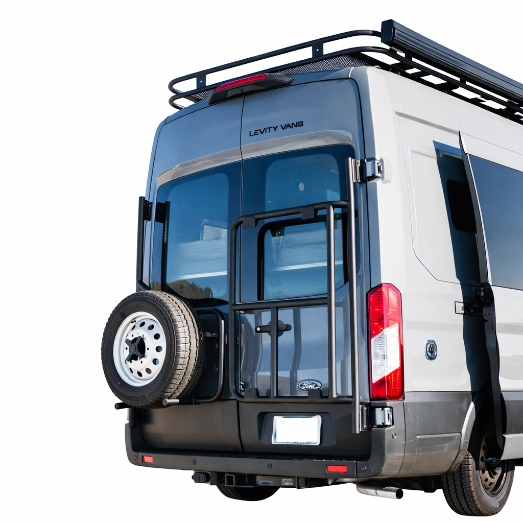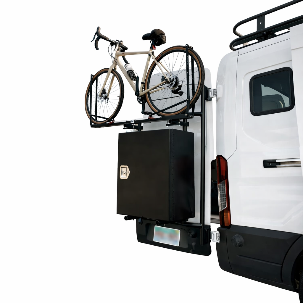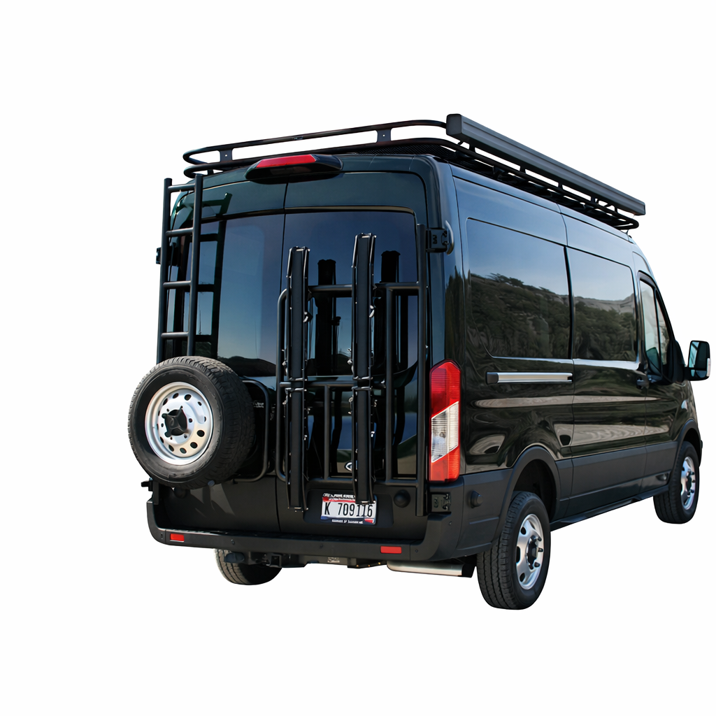 This rear door storage rack is a bolt-on modular mounting system designed for 2015+ Ford Transit vans to support exterior gear such as bikes, storage boxes, and utility accessories. It mounts to factory rear door attachment points without drilling or hinge replacement and serves as a configurable base that can be expanded over time. The system is suited for Transit vans used for travel, commercial work, or off-grid builds where preserving interior space and maintaining rear-door access are important.